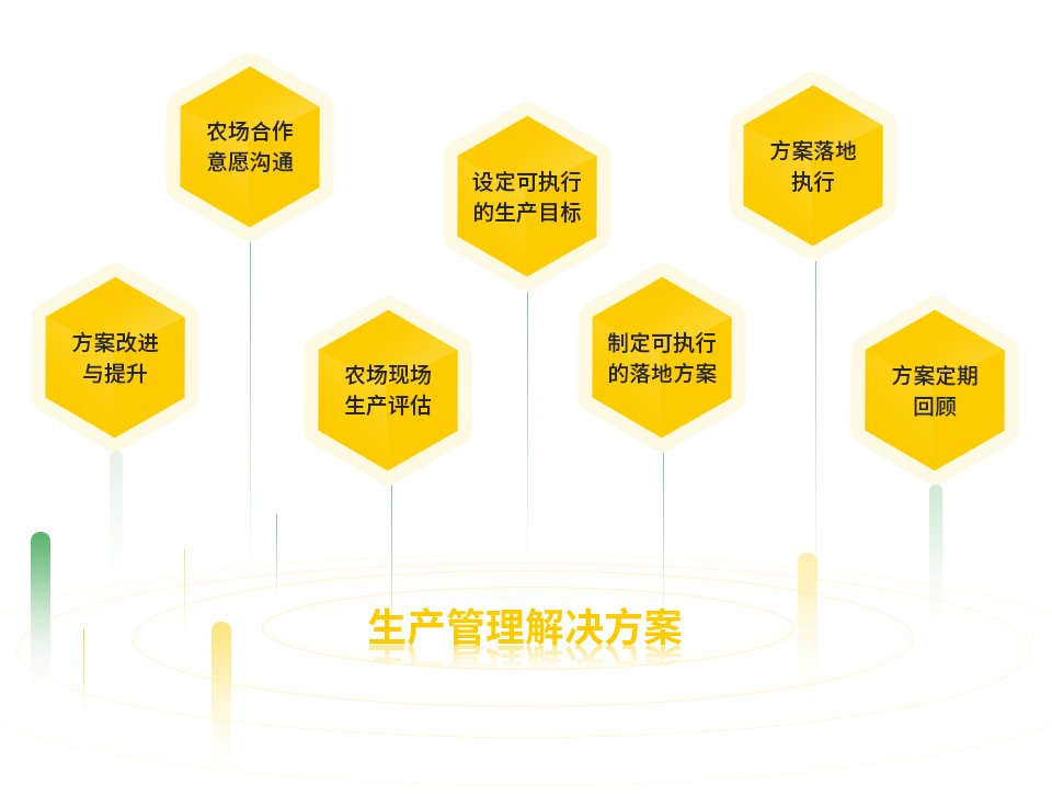 農(nóng)場合作意愿溝通、農(nóng)場現(xiàn)場生產(chǎn)評(píng)估、設(shè)定可執(zhí)行的生產(chǎn)目標(biāo)、制定可執(zhí)行的落地方案、方案落地執(zhí)行、方案定期回顧、方案改進(jìn)與提升,